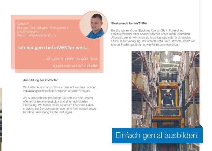 Im Modul „Corporate Design und Corporate Communication“ erwarben die Studierenden Fähigkeiten, um erwartungskonforme und zielgruppenspezifische Dokumente zu erstellen. Anwendung fand dieses Wissen in Zusammenarbeit mit der inVENTer GmbH. Die Studierenden entwarfen eine Bewerberbroschüre, mit dem Ziel, dem Unternehmen den Kontakt zu gut ausbildeten Fachkräften zu ermöglichen.