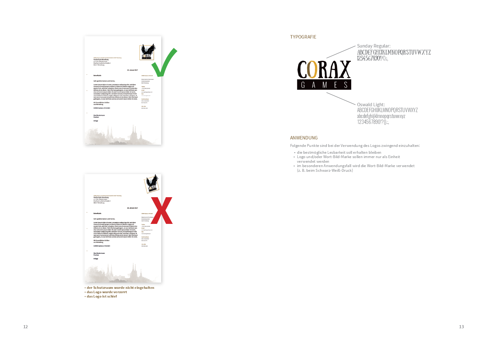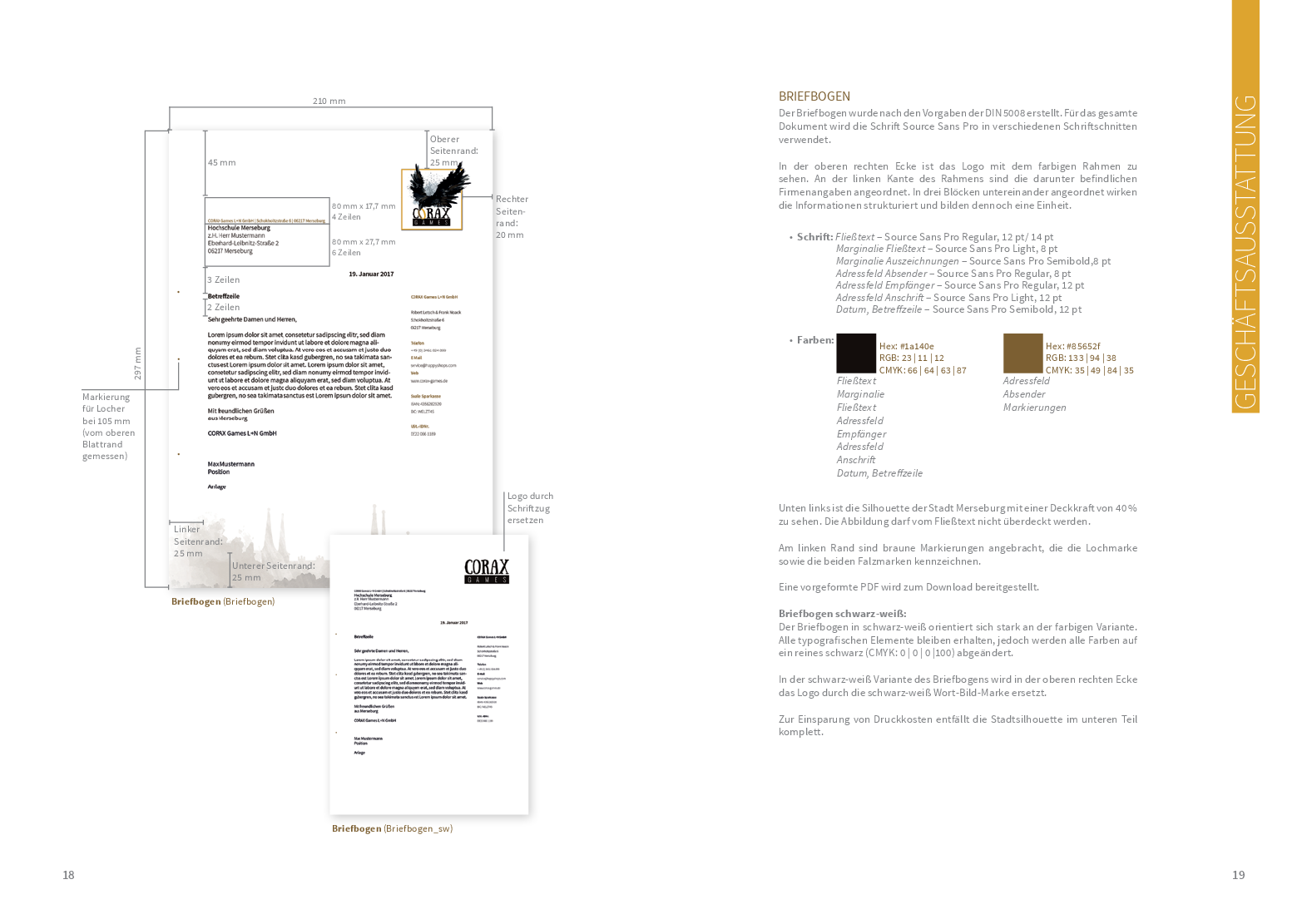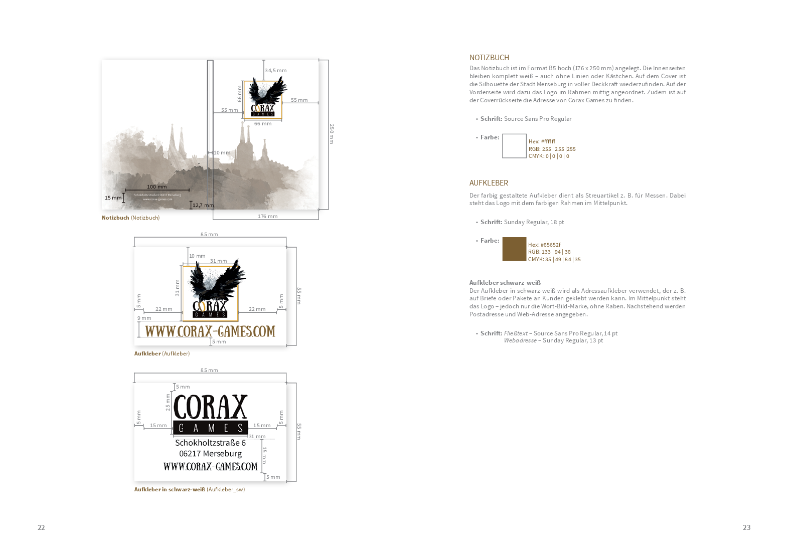 Um von jedem Stakeholder gut wahrgenommen zu werden, braucht es auch hier ein gut strukturiertes Corporate Design. Das Logo, welches sich stark auf die Merseburger Rabensage bezieht, zusammen mit den verwendeten Schriften und Farben wurde den Studierenden als Grundstein bereits vorgegeben. Anhand dessen konzipierten sie – im Rahmen des Moduls ‚Corporate Design‘ – ein Manual, das als ein Regelwerk für unterschiedliche Medien und Gestaltungselemente dient. In enger Zusammenarbeit mit dem Verlag sind somit viele unterschiedliche und kreative Ideen in das Projekt hineingeflossen, was den Prozess umso spannender und lehrreicher für die Studierenden gestaltet hat.