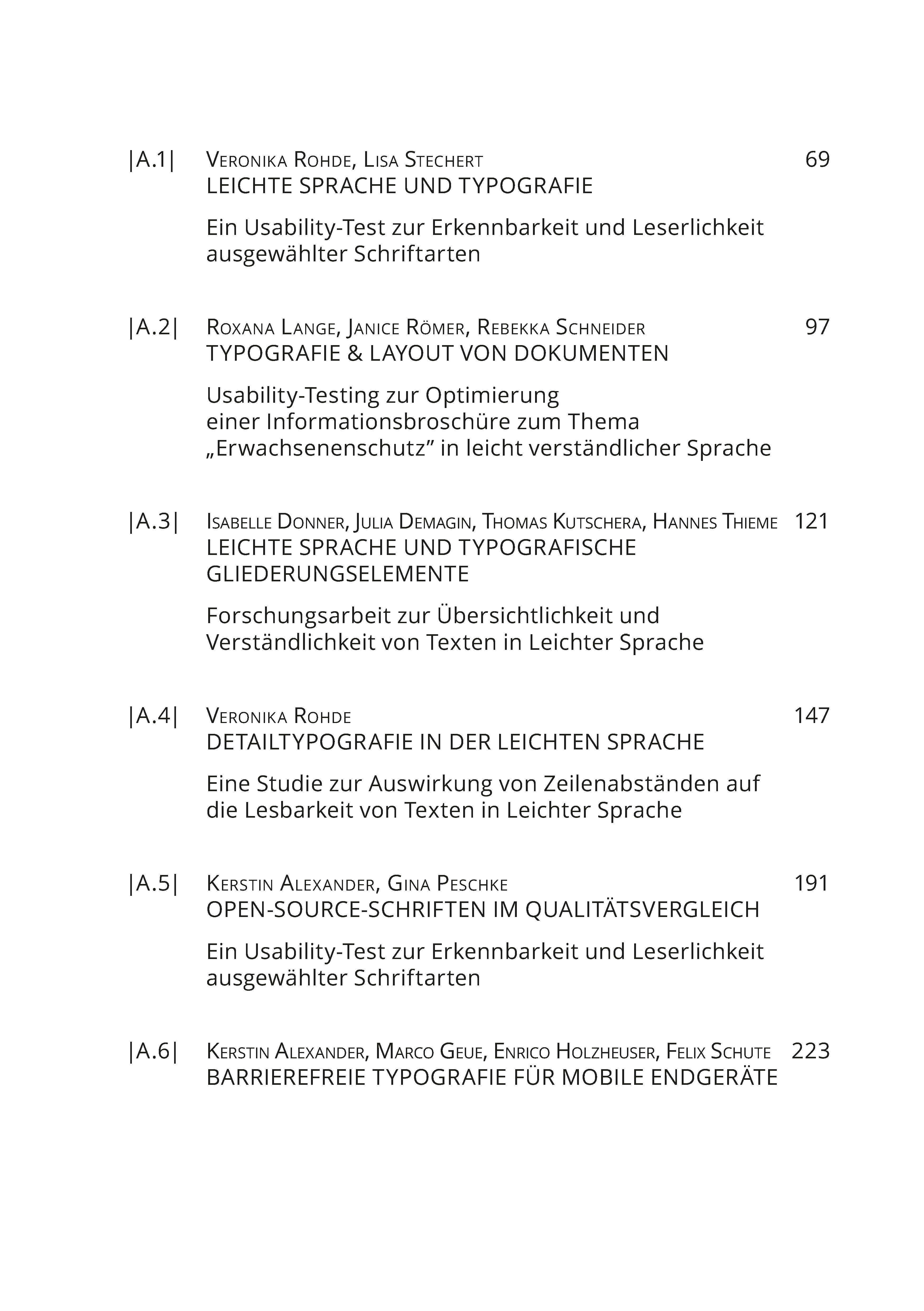 Das Band enthält sechs Studien zur Leserlichkeit von Typografie bzw. Lesbarkeit von Layout sowie sechs Studien zur Verständlichkeit von Bildern in der barrierefreien Kommunikation, die an der Hochschule Merseburg entstanden. Leserinnen und Leser werden auf den Weg des barrierefreien Denkens im Design mitgenommen. Die Studien und wissenschaftlichen Begleittexte helfen, die Wissenlücke in der empirischer Forschung zur barrierefreien Kommunikation im deutschsprachigen Raum zu minimieren und durch das Aufzeigen von Synergien zum Design für Standardleser die barrierefreie Kommunikation stärker in den gesellschaftlichen Diskurs zu bringen.