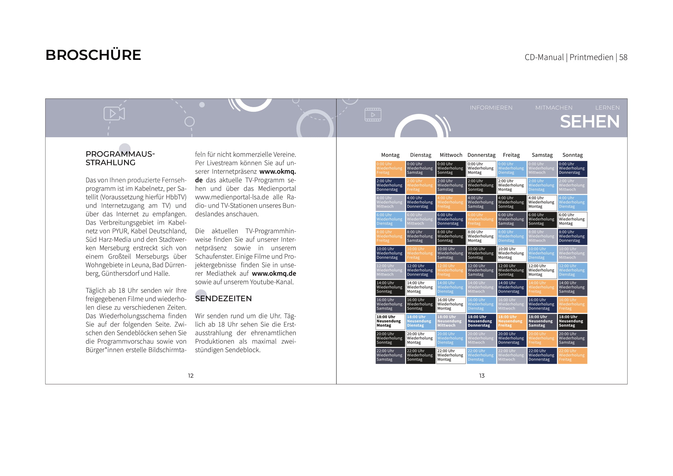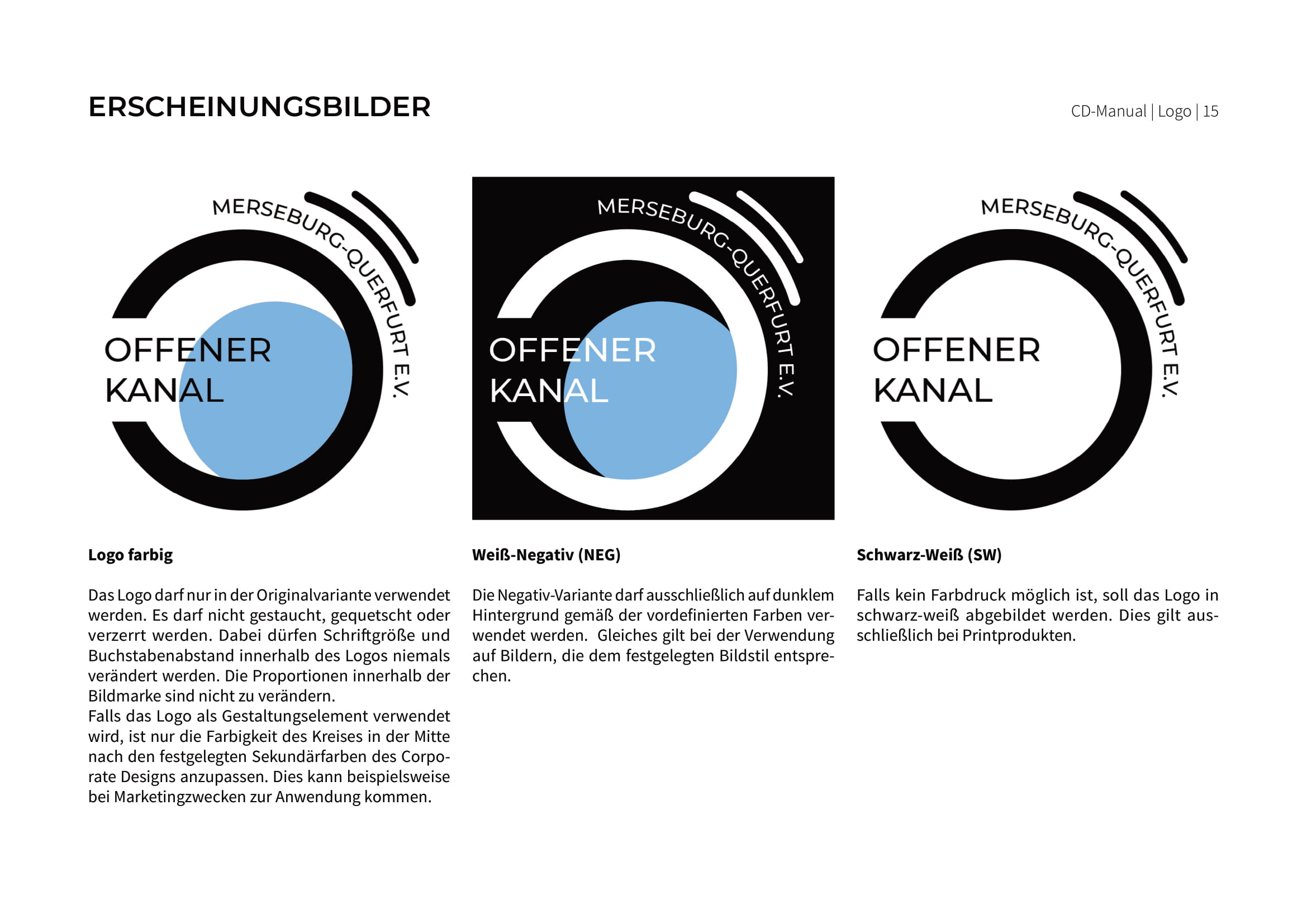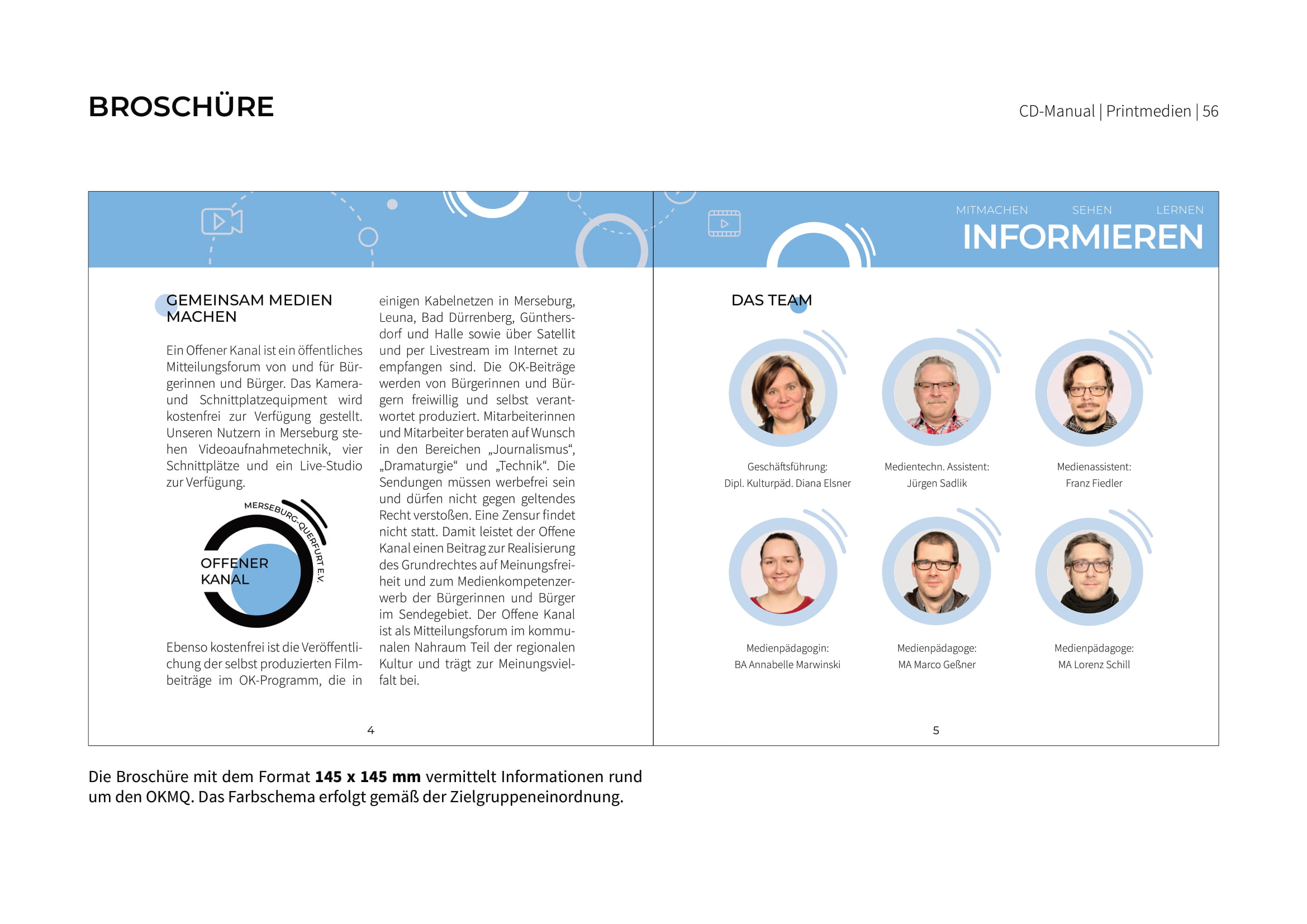 Alle Regeln zur Umsetzung sowie die Ergebnisse der einzelnen Gruppen sind in einem Corporate Design Manual festgehalten. Dieses wurde zum Abschluss dem Offenen Kanal Merseburg-Querfurt e.V. präsentiert und übereicht. Wir hoffen, dass wir dem Verein die nötigen kreativen Impulse sowie neue Sichtweisen an die Hand geben konnten und sind gespannt, welche Ideen in die Tat umgesetzt werden.