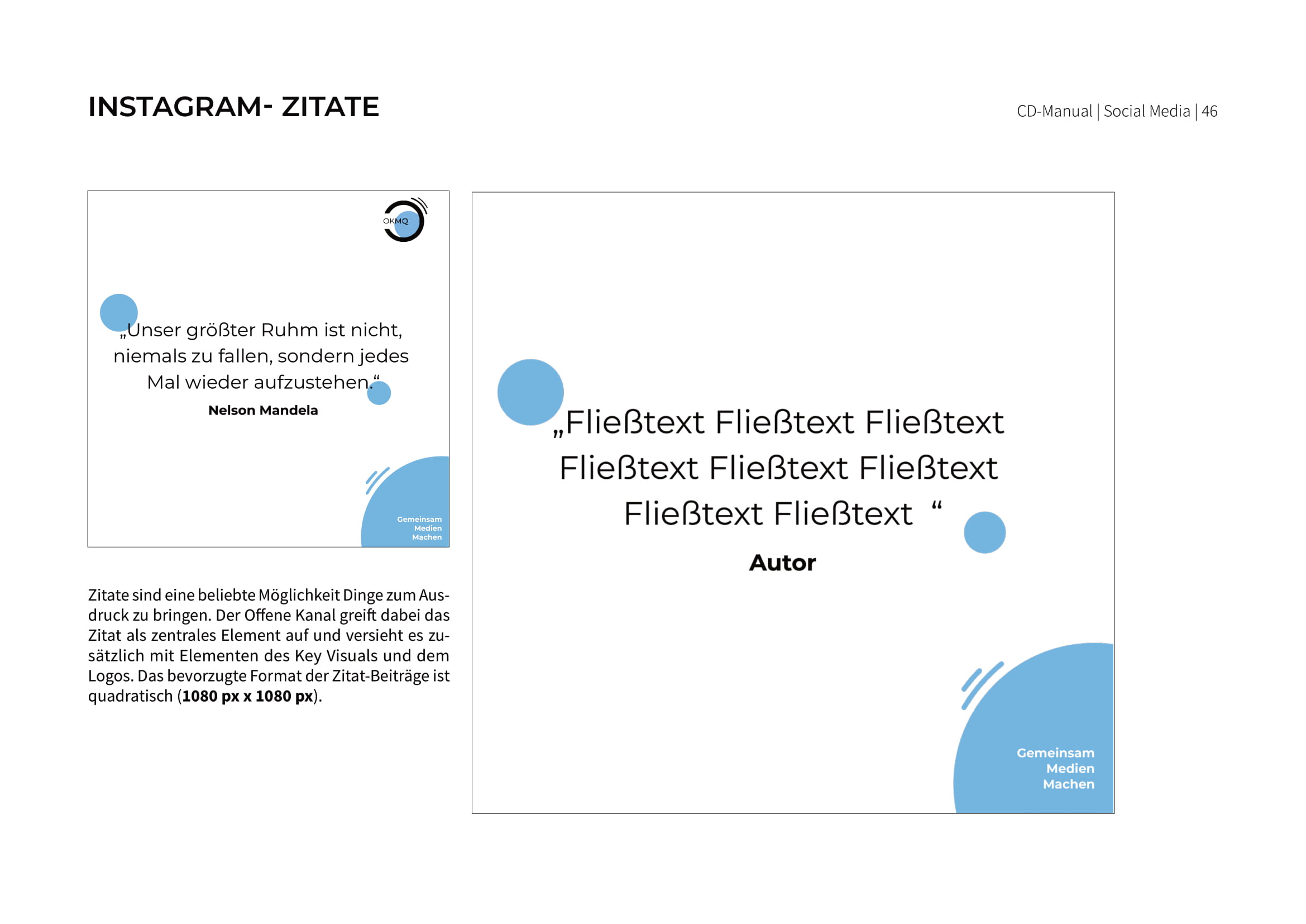 Im Anschluss daran designte jede*r Student*in einen Logoentwurf sowie einen Slogan. Sowohl das finale Logo als auch der Slogan „Gemeinsam Medien Machen“ wurde schlussendlich von den Studierenden festgelegt, da es innerhalb des Offenen Kanals zu Differenzen/ Unsicherheiten kam. Mit dem Logo als Grundlage, welches Farben und die Typografie fest definiert starteten die Gruppenarbeiten.
