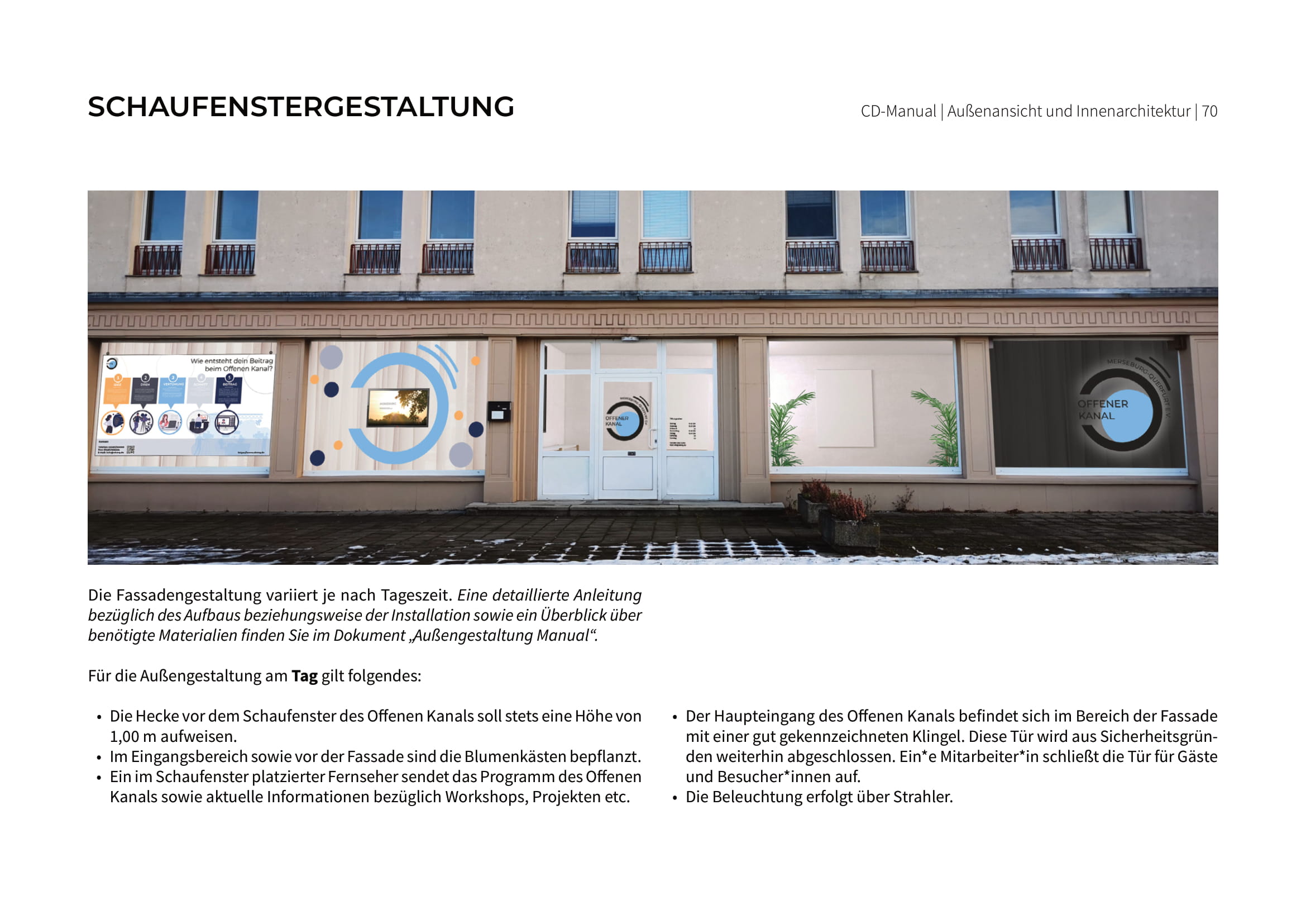 Um auch einen Wiedererkennungseffekt mittels der Außenansicht des Vereins zu erreichen wurden Vorschläge zur Umgestaltung des Schaufensters entsprechend des Corporate Design entwickelt.