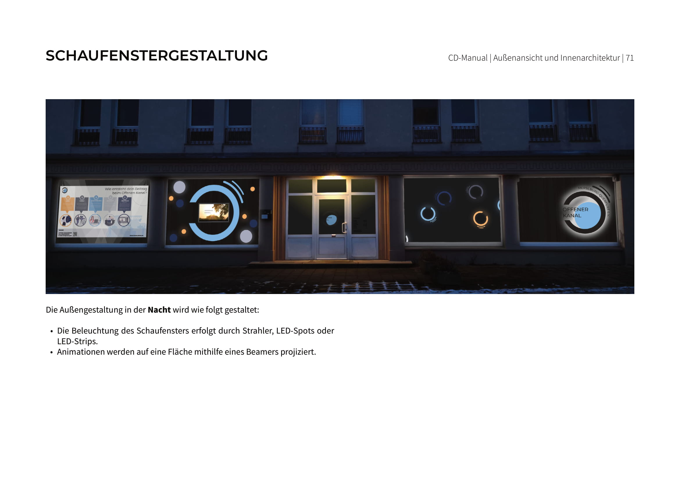 Unter anderem gab es die Idee einer Logoanimation, welche abends durch einen Beamer auf eine Projektionsfläche an das Schaufenster gestrahlt wird.