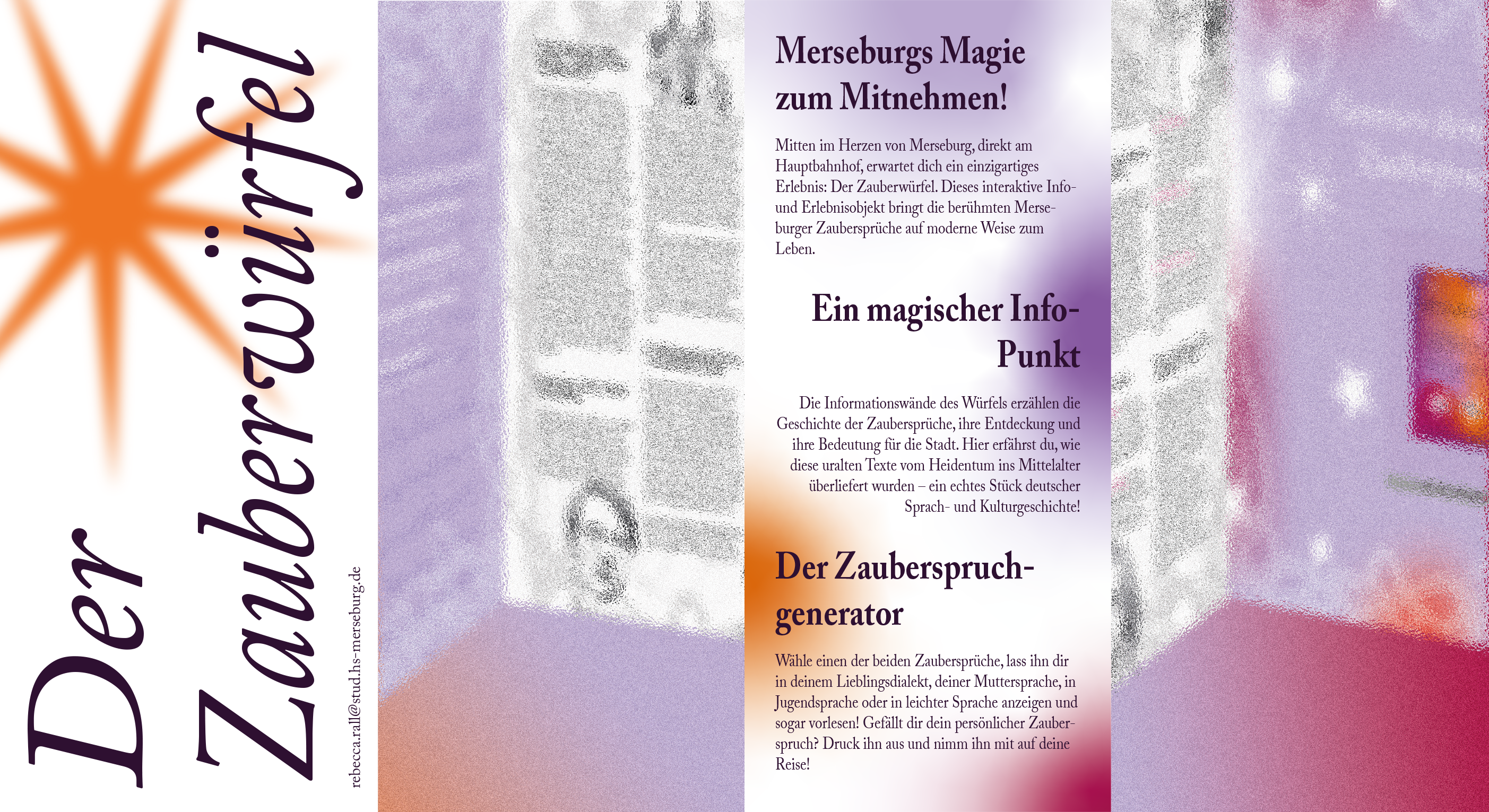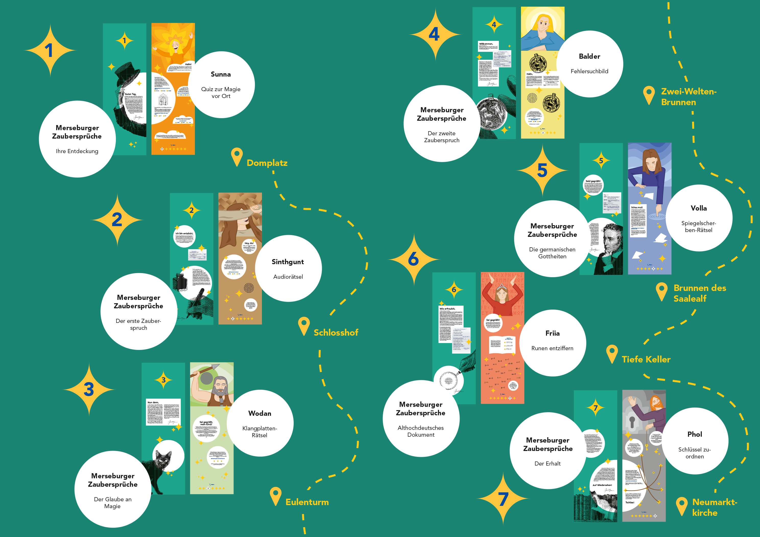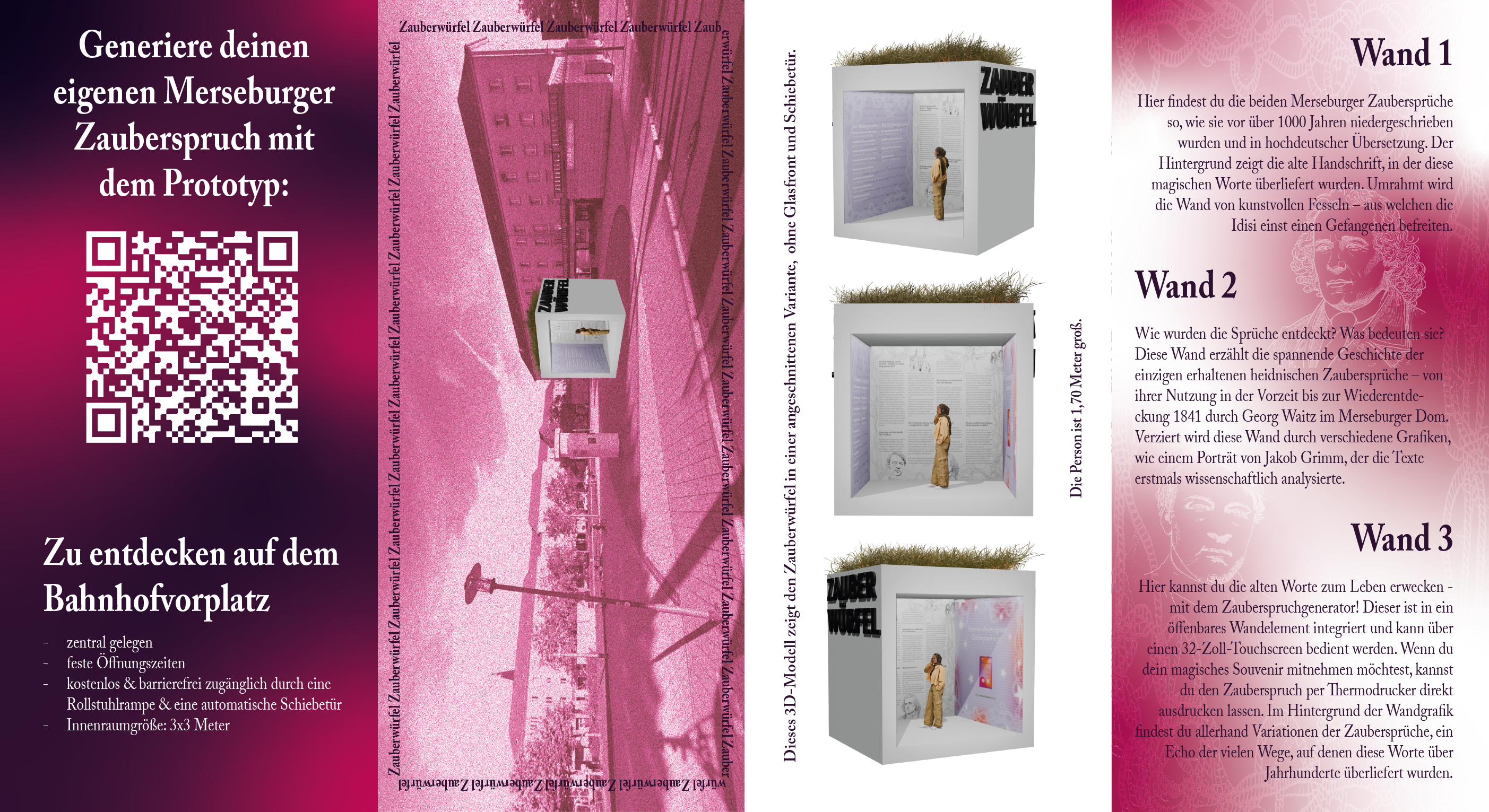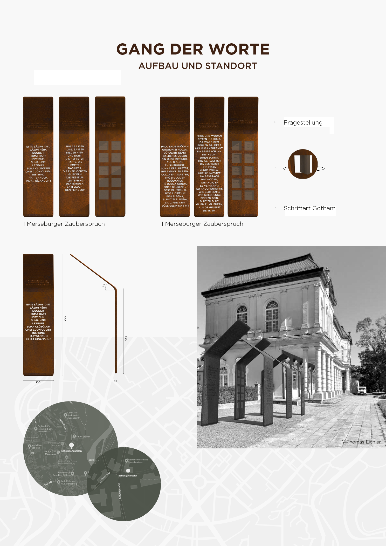 Im Vorfeld der eigenen Konzeptentwicklung recherchierten die Studierenden zu unterschiedlichen Ausstellungs- und Präsentationsformaten. Einige Ergebnisse sind hier zu sehen. Einen vertiefenden Einblick in das Projekt vermittelt der Artikel Gestaltungswettbewerb: Merseburger Zaubersprüche im öffentlichen Raum von Christian Franke.