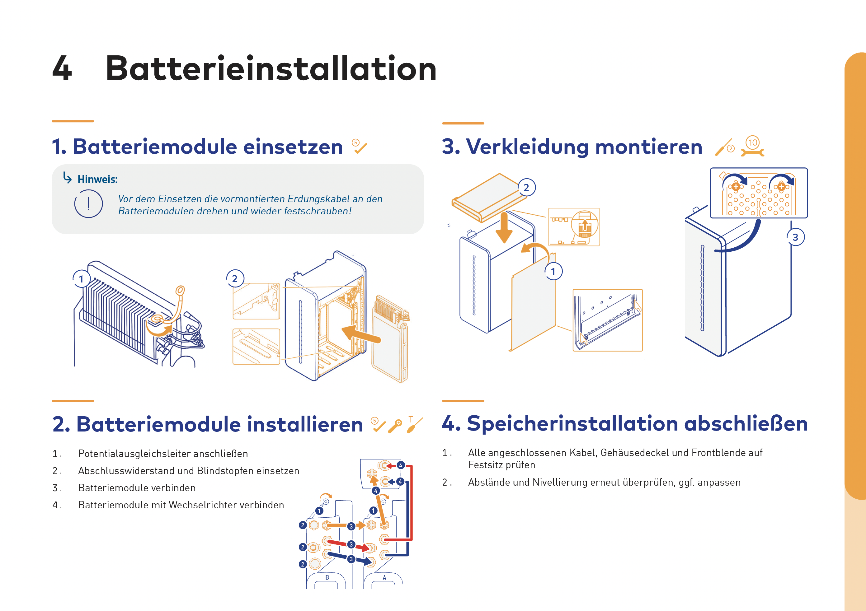 Die SENEC GmbH ist Anbieter von Komplettlösungen im Bereich Photovoltaik-Anlagen. Die Aufgabe der Studierenden bestand darin, eine Anleitung für die Montage und Inbetriebnahme des Speichersystems SENEC Home.4 zu entwerfen und umzusetzen. Die besondere Herausforderung war, ein möglichst kompaktes und platzsparendes Format zu entwickeln, das von der Zielgruppe (Fachpersonal, wie z. B. Servicetechniker) direkt vor Ort zur unmittelbaren Unterstützung des Montageprozesses genutzt werden kann. Um dieses Ziel zu erreichen, mussten die Projektgruppen die zentralen Montageschritte ermitteln und geeignete, möglichst kompakte visuelle Darstellungsformen für eine spracharme Anleitung entwickeln.